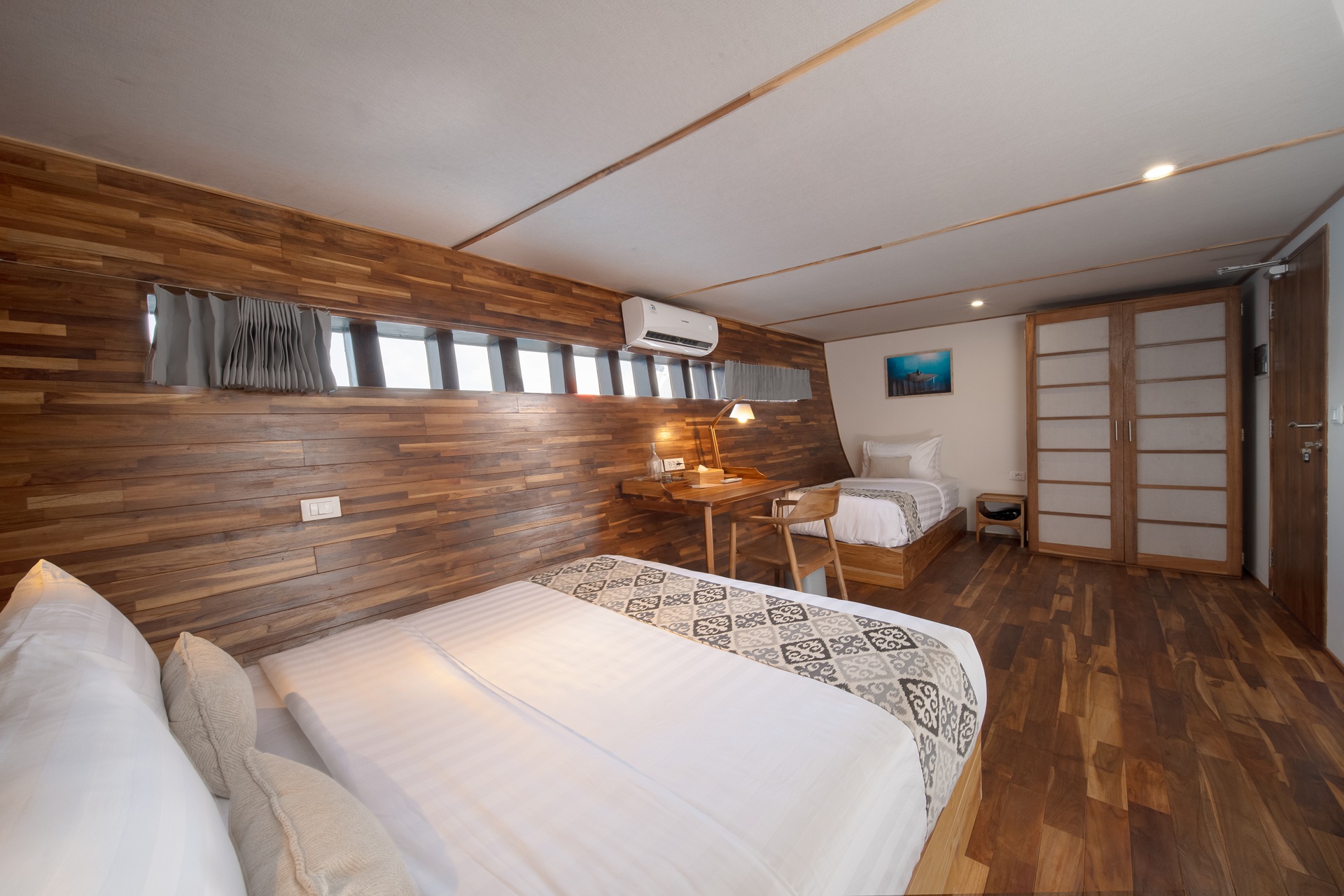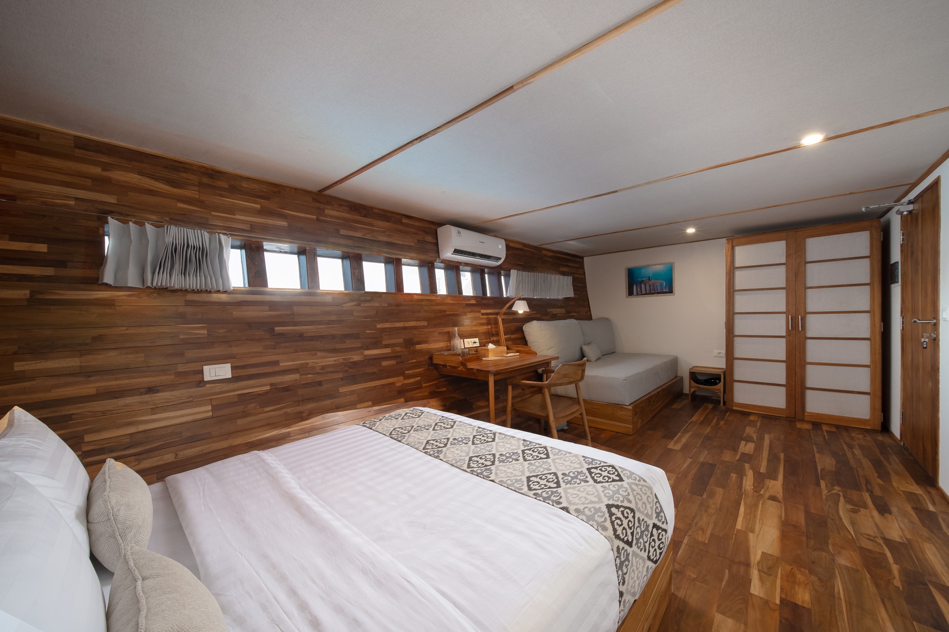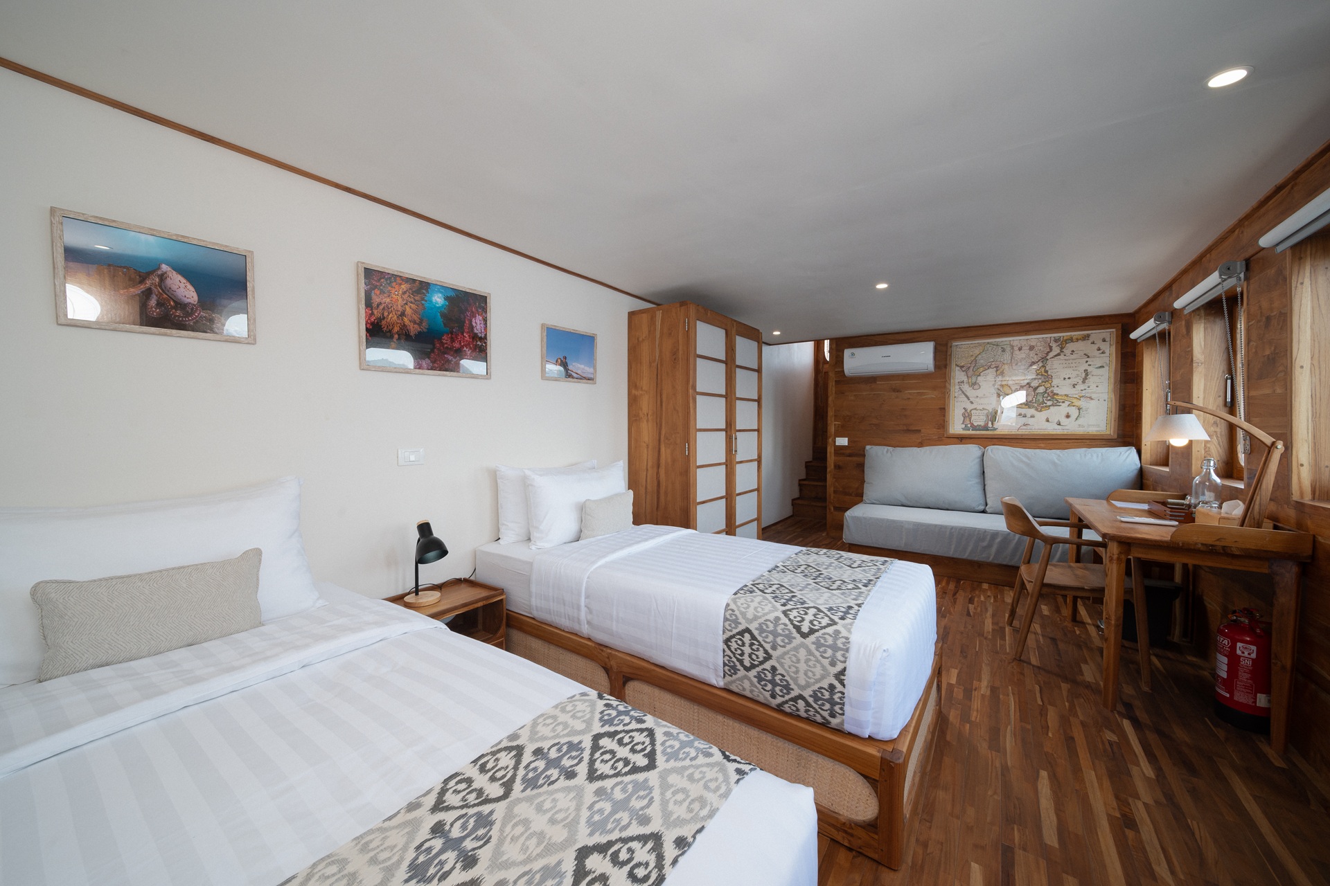 Naga Biru offers modern comforts, including air-conditioned cabins with en suite bathrooms, a dedicated camera room, indoor and outdoor dining areas, a sundeck, and a well-equipped diving deck. Each amenity is thoughtfully chosen to enhance your journey at sea.